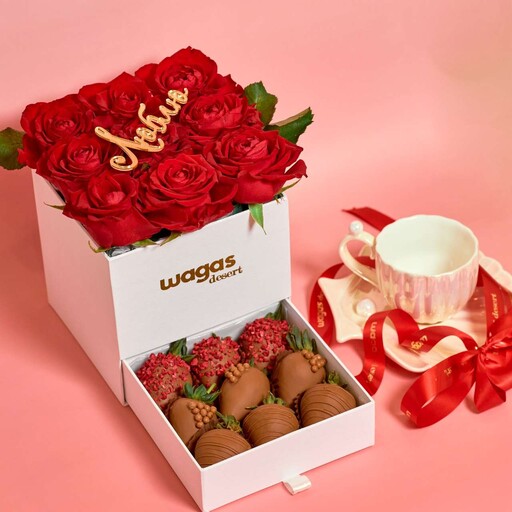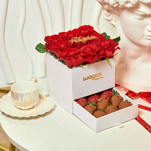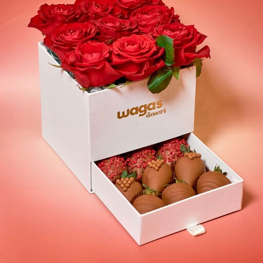 Коробка-шкатулка с красными розами и клубникой в молочном шоколаде. Розы находятся в флористической губке с водой, которая обеспечивает сохранность набора на длительный период. Интересный вариант, который сочетает в себе цветы и десерт.