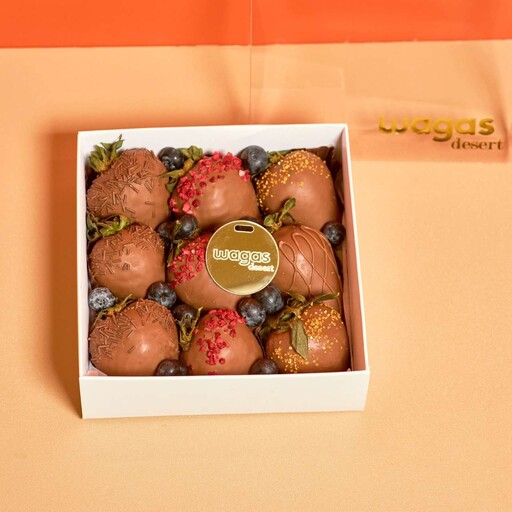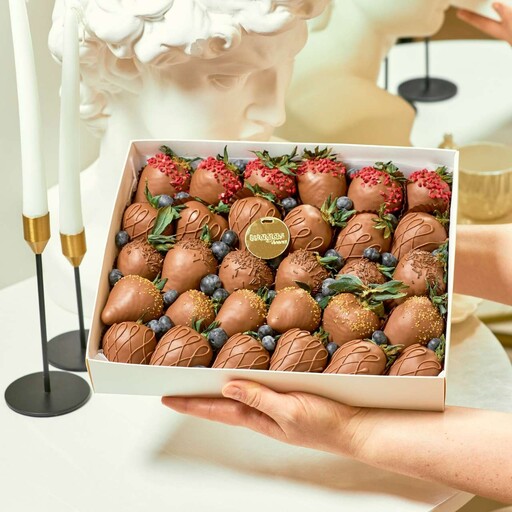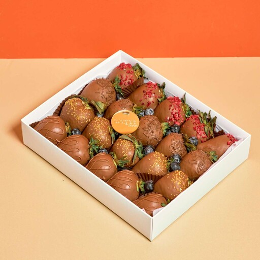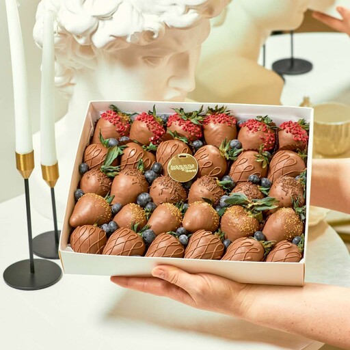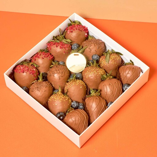 Состав: Клубника свежая; Шоколад молочный, белый, клубничный; Шоколадная посыпка; Сублимированная малина; Цветной сахар; Голубика.