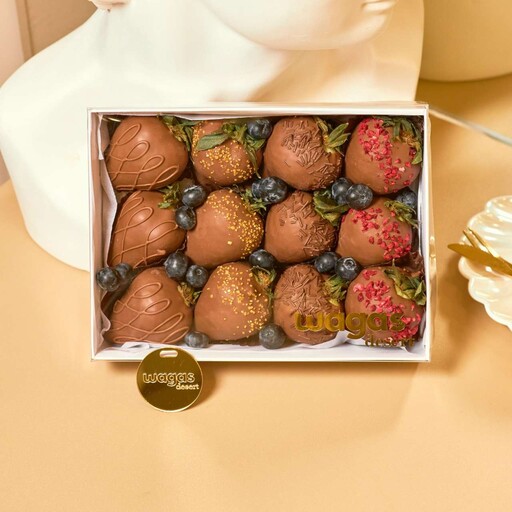 Состав: Клубника свежая 12шт; Вес 480гр; Шоколад молочный; Шоколадная посыпка; Сублимированная малина; Цветной сахар; Голубика.