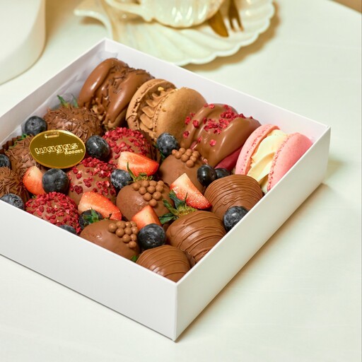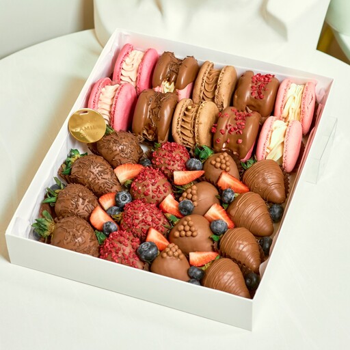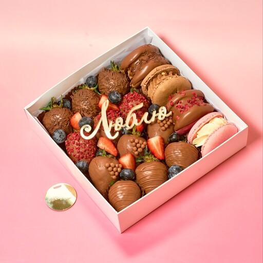 В наборе: • 16 клубник в шоколаде — отборные ягоды, покрытые молочным шоколадом и украшенные изящным декором. • 10 макаронс — воздушные миндальные пирожные с нежной кремовой начинкой.