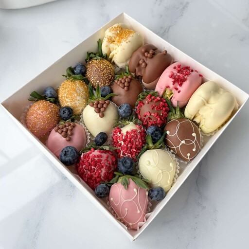 Состав: Клубника свежая; Макарон в ассортименте; Шоколад молочный; Шоколадная посыпка; Сублимированная малина; Голубика; Нарезка клубники.