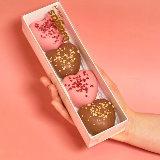 Японский десерт Моти на основе сливок, творожного сыра и ягодно-шоколадного сердечка, укутанный в рисовое тесто.