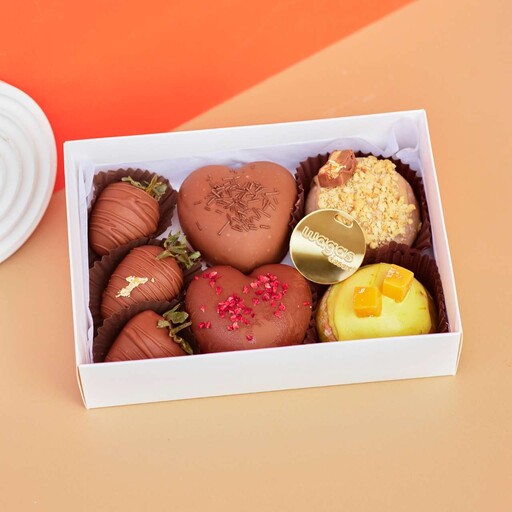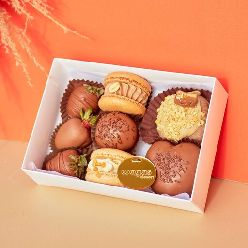 Зефир в молочном шоколаде 1 шт; Клубника в молочном шоколаде 3шт; Моти 1 шт Сникерс или Манго-маракуйя (вкусы могут меняться, в зависимости от наличия на день поставки); Макарон 2 шт Сникерс и Двойная карамель (вкусы могут меняться, в зависимости от наличия на день поставки); Картошка в молочном шоколаде 1шт;
