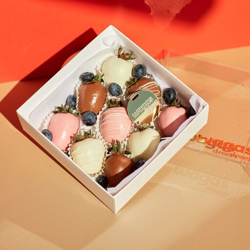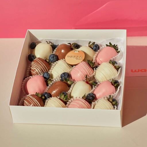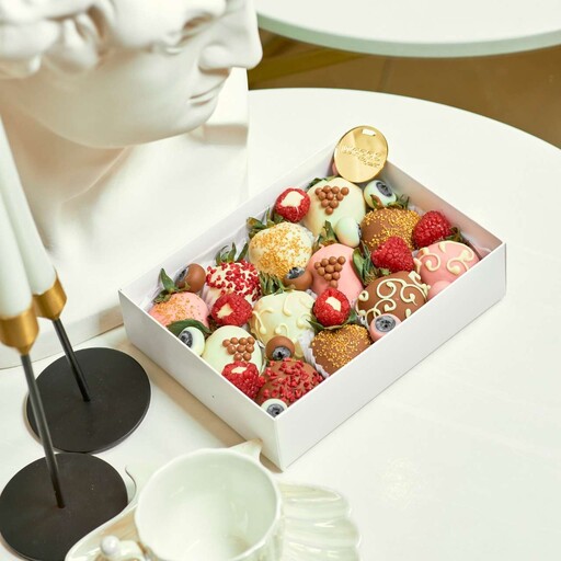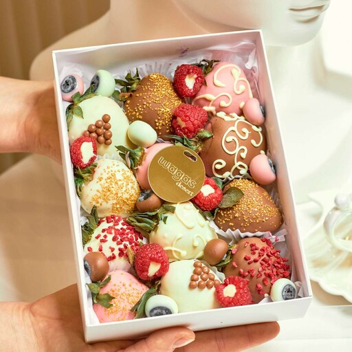 Состав: Клубника свежая; Шоколад молочный, белый, клубничный; Шоколадная посыпка; Сублимированная малина; Цветной сахар; Голубика.