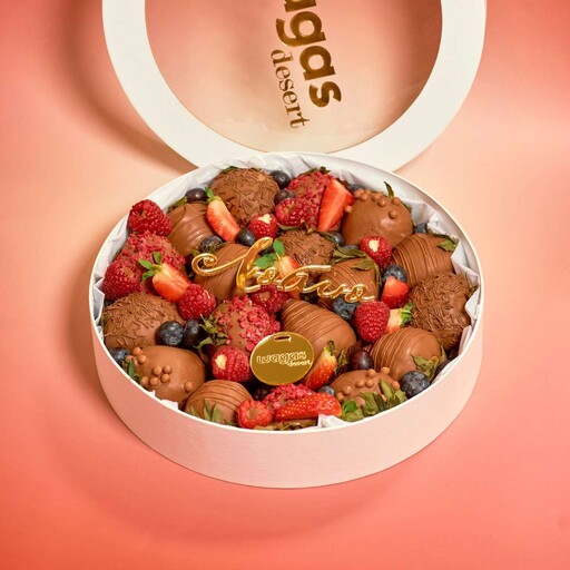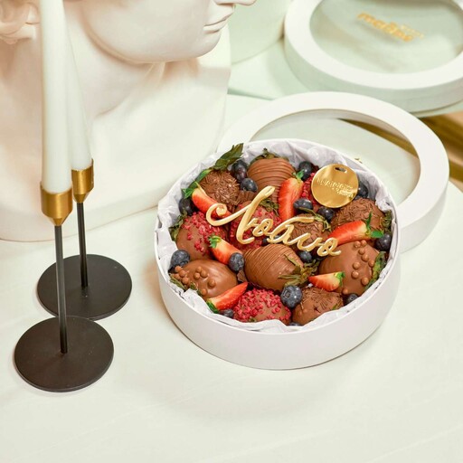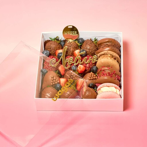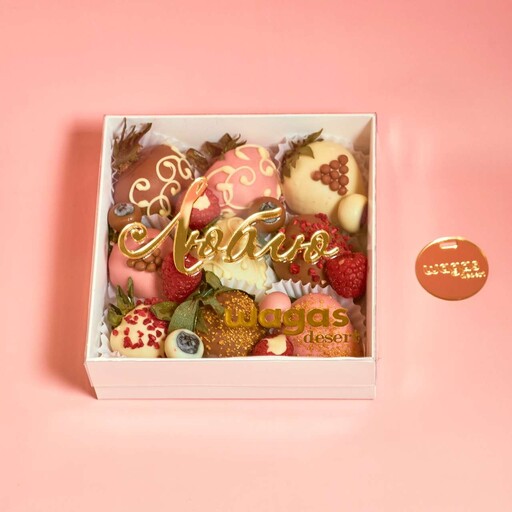 Состав: Клубника в шоколаде ассорти: молочный, белый и клубничный. Клубника без шоколада Шоколадная посыпка; Сублимированная малина; Цветной сахар; Голубика; Малина.