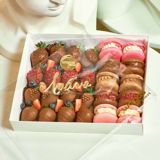 Один из самых популярных наборов, в котором сочетается клубника в шоколаде и макарон. Макарон-французские пирожные, на основе миндальной муки и шоколадного крема, с ягодным сердечком. Вкусы ассорти: фисташка-малина, клубничный йогурт, мак-лимон, сникерс, двойная карамель (в набор идут вкусы в зависимости от наличия в день заказа).