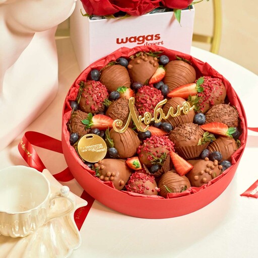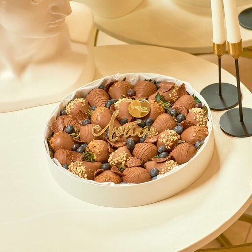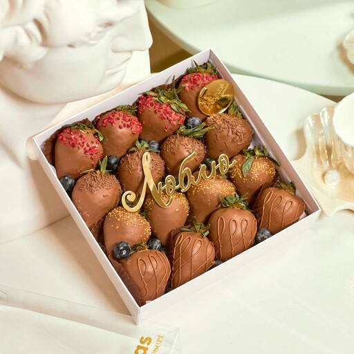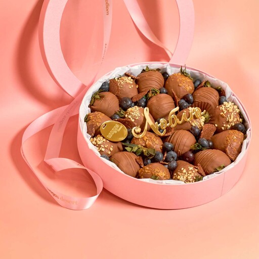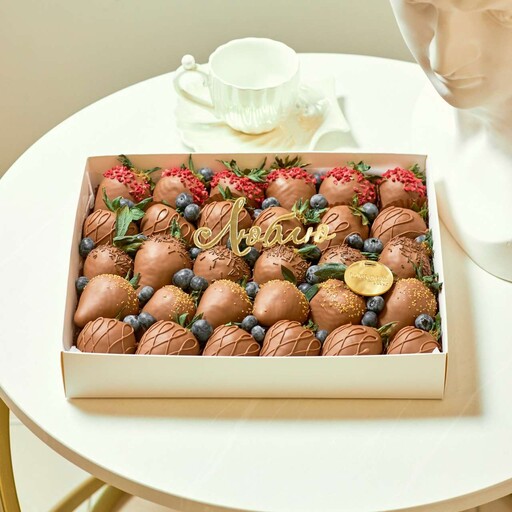 Состав: Клубника свежая 23-25 клубник; Шоколад молочный; Шоколадная посыпка; Сублимированная малина; Нарезка клубники; Голубика.
