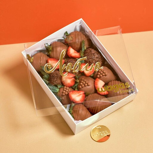 Состав: Клубника свежая 18-20 клубник; Шоколад молочный; Шоколадная посыпка; Сублимированная малина; Нарезка клубники; Голубика.
