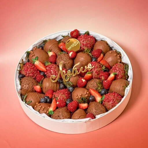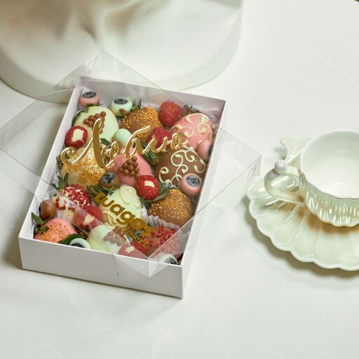 Состав: Клубника свежая 23-25шт; Шоколад молочный. Шоколадная посыпка; Сублимированная малина; Нарезка клубники; Малина; Голубика.