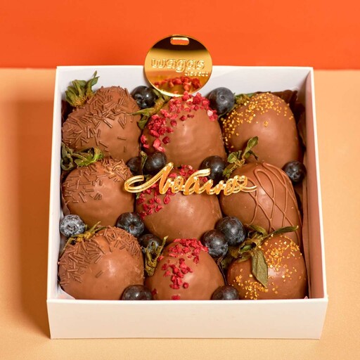 Состав: Клубника свежая 9шт; Шоколад молочный, белый, клубничный; Шоколадная посыпка; Сублимированная малина; Цветной сахар; Голубика.