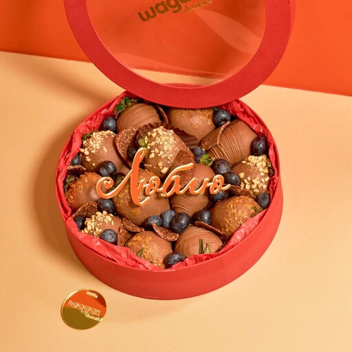 Состав: Клубника свежая 13-16шт; Шоколад молочный; Вафельная крошка; Арахисовая крошка; Чипсы шоколадные; Голубика.